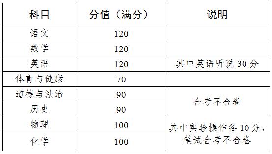根据省教育厅规定,初中学业水平考试科目涵盖国家《义务教育课程设置实验方案》(7~9年级)规定的全部科目,包括语文、数学、英语(含英语听说)、道德与法治、历史、地理、物理、化学、生物、体育与健康、音乐、美术、信息技术等科目,引导学生认真学习每门课程,达到合格要求,确保初中教育的基本质量。初中学业水平考试科目分为录取计分科目和录取参考科目。录取计分科目的考试由市统一封闭式命题并组织实施;录取参考科目的考试由市统一命题,并组织各区具体实施。