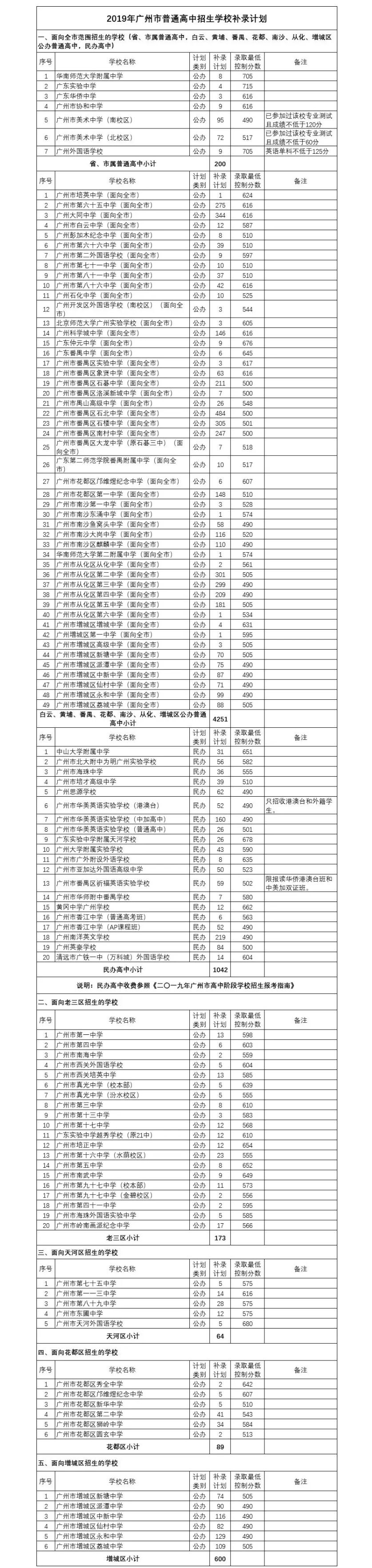 公办普通高中学校补录计划不再区分户籍生或符合报考公办普通高中条件的随迁子女招生计划。2019年我市普通高中招生学校补录计划详见下图。学校信息详见《二〇一九年广州市高中阶段学校招生报考指南》(简称《报考指南》,下同)。